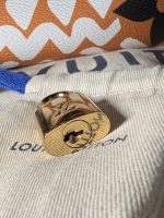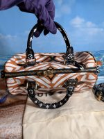 Near-perfect condition. Faint scratches & faint discoloration on some areas of hardware.